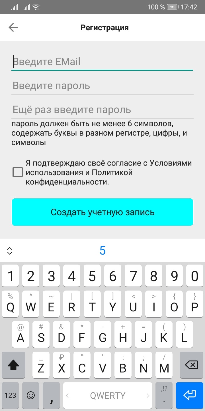 Введите свой Email и пароль для создаваемого. EMail будет использоваться в качестве логина. Пароль должен быть сложным- не менее 6 символов и содержать буквы в разном регистре, цифры и символы.