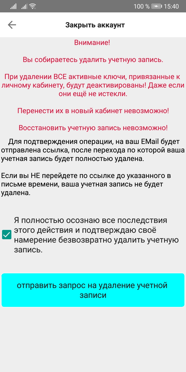 Удаление аккаунта(учетной записи) является необратимой операция. Это значит что при удалении вы теряете любой доступ к всем данным содержащимся в личном кабинете. Например, если в вашем аккаунте зарегистрированы активные ключи, или еще не активированные ключи, то при удалении они будут деактивированы. Перенести их в новый личный кабинет невозможно. Также невозможно восстановить аккаунт после удаления.
